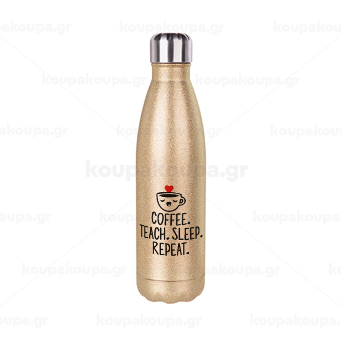 Coffee Teach Sleep Repeat, Μεταλλικό παγούρι θερμός Glitter χρυσό (Stainless steel), διπλού τοιχώματος, 500ml