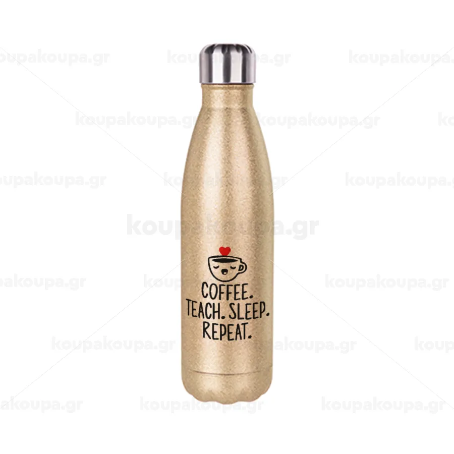 Coffee Teach Sleep Repeat, Μεταλλικό παγούρι θερμός Glitter χρυσό (Stainless steel), διπλού τοιχώματος, 500ml