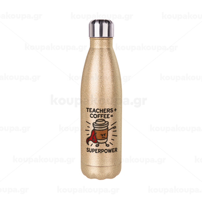Teacher Coffee Super Power, Μεταλλικό παγούρι θερμός Glitter χρυσό (Stainless steel), διπλού τοιχώματος, 500ml