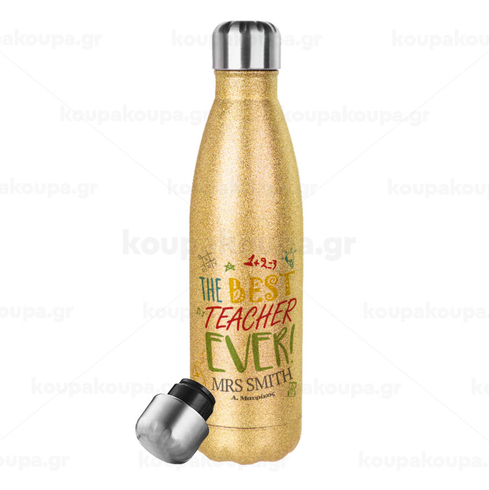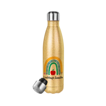 The best teacher ever!, Μεταλλικό παγούρι θερμός Glitter χρυσό (Stainless steel), διπλού τοιχώματος, 500ml