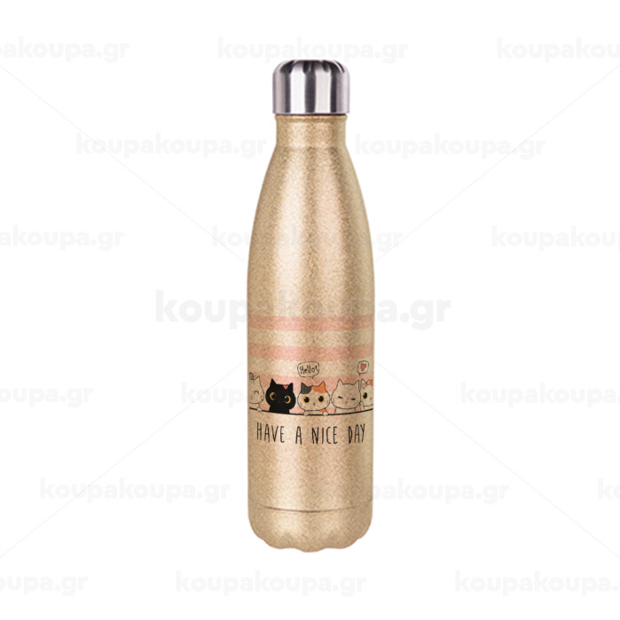 Have a nice day cats, Μεταλλικό παγούρι θερμός Glitter χρυσό (Stainless steel), διπλού τοιχώματος, 500ml