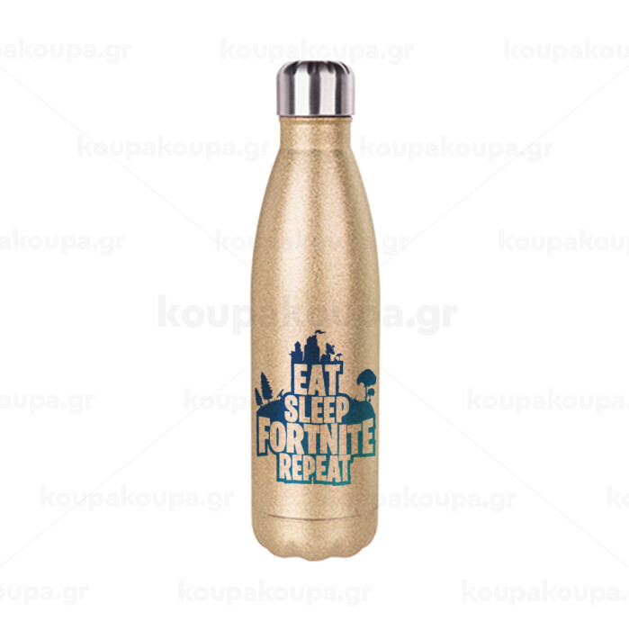 Eat Sleep Fortnite Repeat, Μεταλλικό παγούρι θερμός Glitter χρυσό (Stainless steel), διπλού τοιχώματος, 500ml
