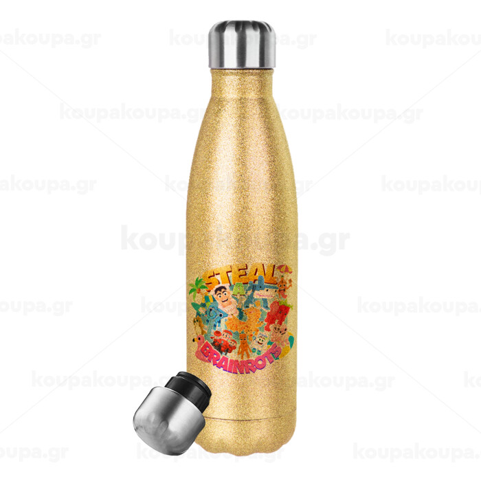 Roblox Steal a Brainrot, Μεταλλικό παγούρι θερμός Glitter χρυσό (Stainless steel), διπλού τοιχώματος, 500ml