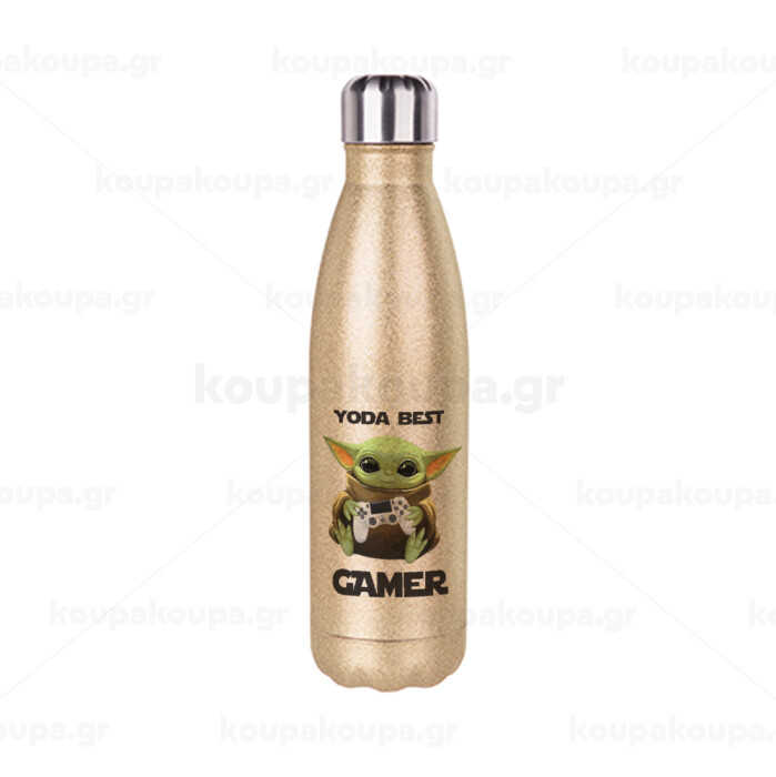Yoda Best Gamer, Μεταλλικό παγούρι θερμός Glitter χρυσό (Stainless steel), διπλού τοιχώματος, 500ml