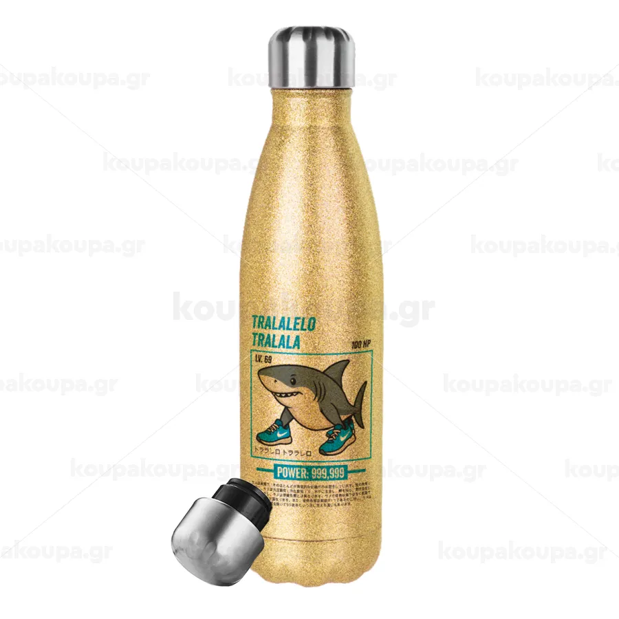 Tralalero Tralala, Μεταλλικό παγούρι θερμός Glitter χρυσό (Stainless steel), διπλού τοιχώματος, 500ml