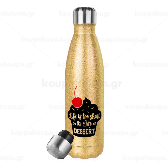 Life is too short, to skip Dessert, Μεταλλικό παγούρι θερμός Glitter χρυσό (Stainless steel), διπλού τοιχώματος, 500ml