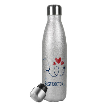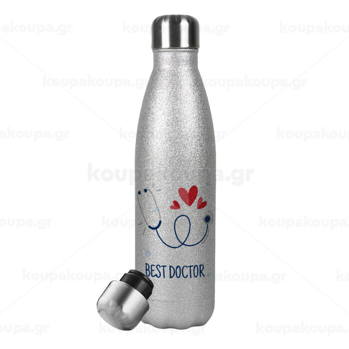 Best Doctor, Μεταλλικό παγούρι θερμός Glitter Aσημένιο (Stainless steel), διπλού τοιχώματος, 500ml