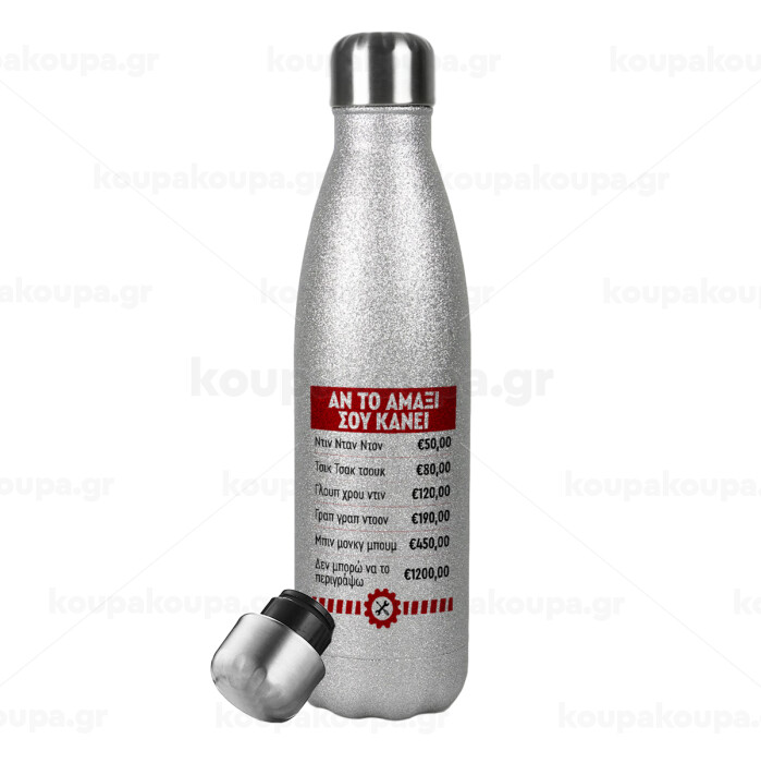 Annoying Noise in Car, Μεταλλικό παγούρι θερμός Glitter Aσημένιο (Stainless steel), διπλού τοιχώματος, 500ml