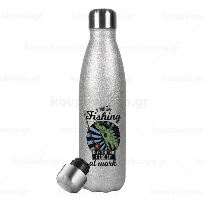 A bad day FISHING is better than a good day at work, Μεταλλικό παγούρι θερμός Glitter Aσημένιο (Stainless steel), διπλού τοιχώματος, 500ml