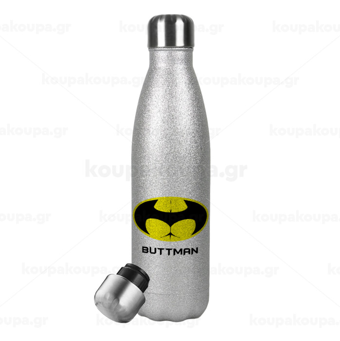Buttman, Μεταλλικό παγούρι θερμός Glitter Aσημένιο (Stainless steel), διπλού τοιχώματος, 500ml