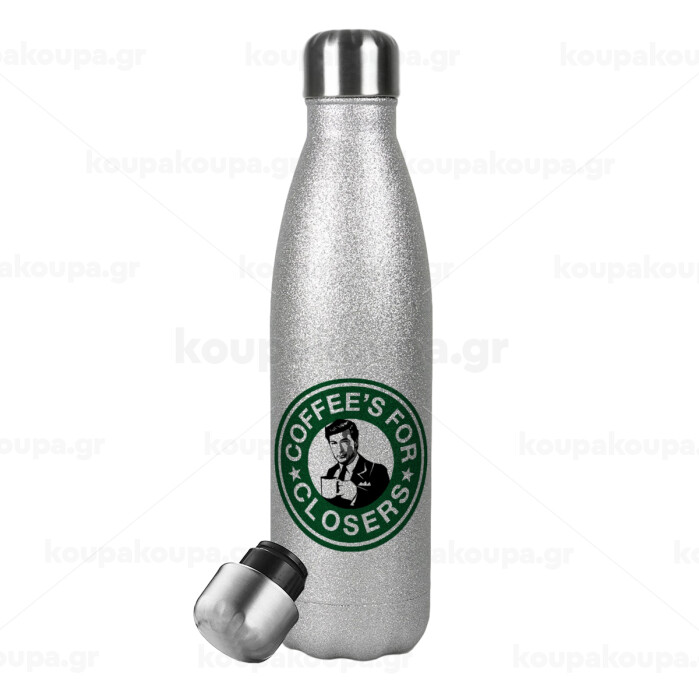 Coffee's for closers, Μεταλλικό παγούρι θερμός Glitter Aσημένιο (Stainless steel), διπλού τοιχώματος, 500ml