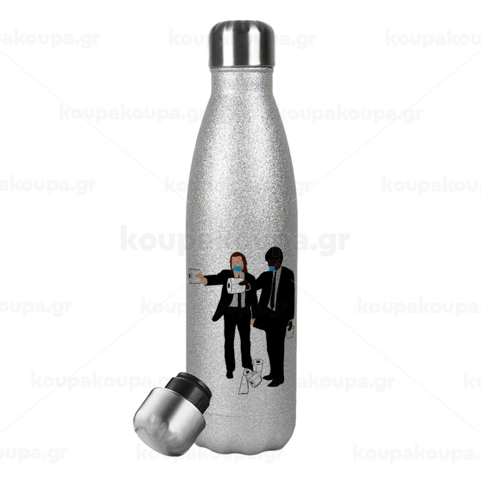 Pulp Fiction 3 meter away, Μεταλλικό παγούρι θερμός Glitter Aσημένιο (Stainless steel), διπλού τοιχώματος, 500ml
