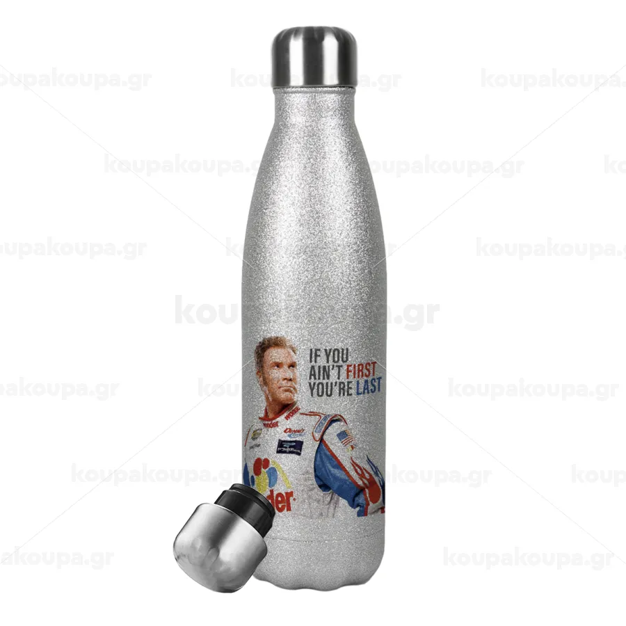 If You Ain't First You're Last Ricky Bobby, Talladega Nights, Μεταλλικό παγούρι θερμός Glitter Aσημένιο (Stainless steel), διπλού τοιχώματος, 500ml