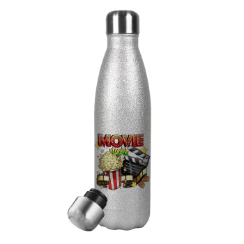 Movie night, Μεταλλικό παγούρι θερμός Glitter Aσημένιο (Stainless steel), διπλού τοιχώματος, 500ml