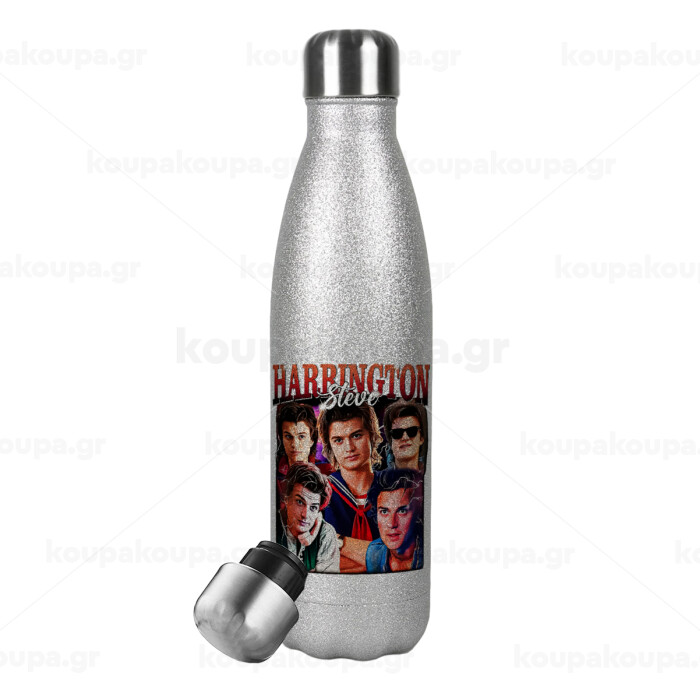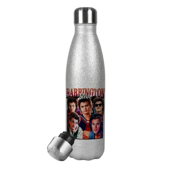Steve Harrington, Stranger Things, Μεταλλικό παγούρι θερμός Glitter Aσημένιο (Stainless steel), διπλού τοιχώματος, 500ml