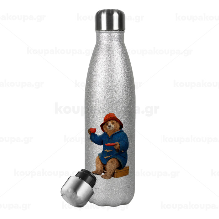 Αρκουδάκι Πάντινγκτον, Μεταλλικό παγούρι θερμός Glitter Aσημένιο (Stainless steel), διπλού τοιχώματος, 500ml
