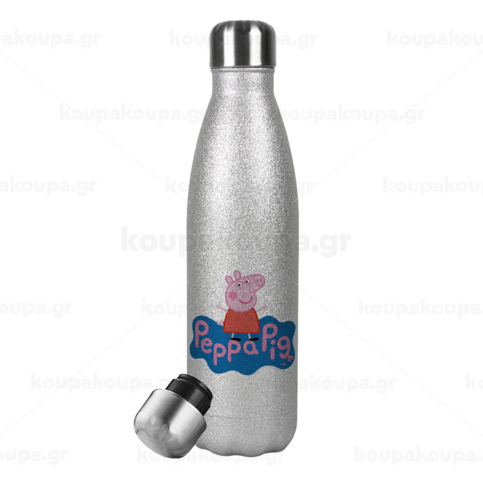 Πέππα το γουρουνάκι μπλε με όνομα, Μεταλλικό παγούρι θερμός Glitter Aσημένιο (Stainless steel), διπλού τοιχώματος, 500ml