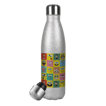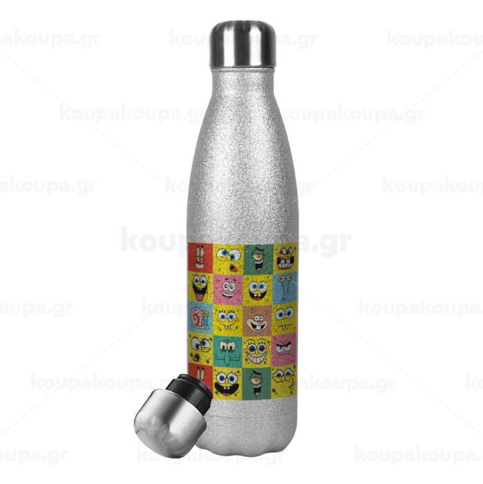 Ο μπομπ και οι φίλοι του, Μεταλλικό παγούρι θερμός Glitter Aσημένιο (Stainless steel), διπλού τοιχώματος, 500ml