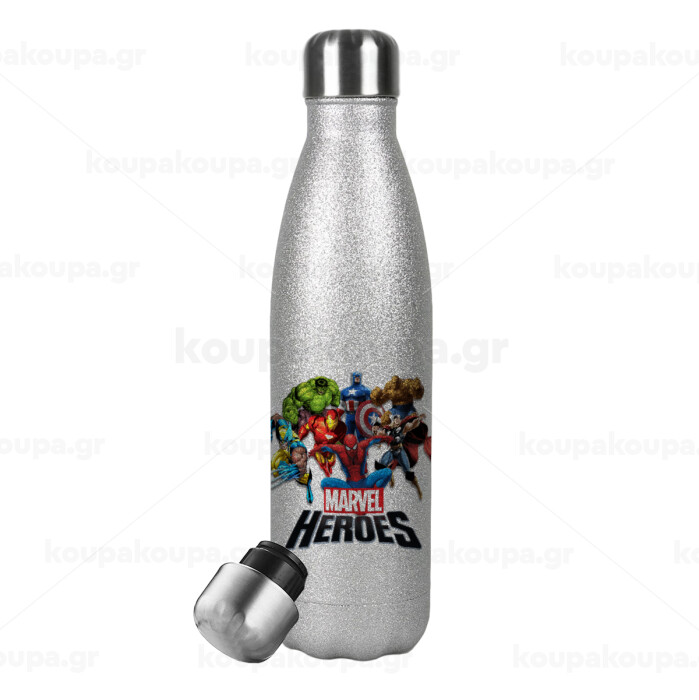 MARVEL heroes, Μεταλλικό παγούρι θερμός Glitter Aσημένιο (Stainless steel), διπλού τοιχώματος, 500ml