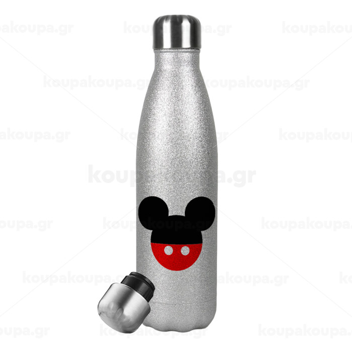 Mickey head, Μεταλλικό παγούρι θερμός Glitter Aσημένιο (Stainless steel), διπλού τοιχώματος, 500ml