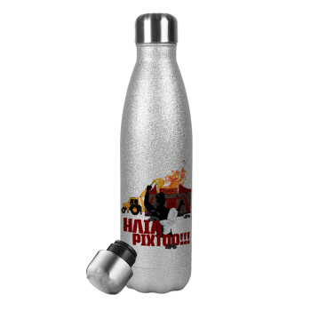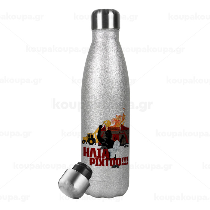 Ηλία ρίχτοοο!!!, Μεταλλικό παγούρι θερμός Glitter Aσημένιο (Stainless steel), διπλού τοιχώματος, 500ml