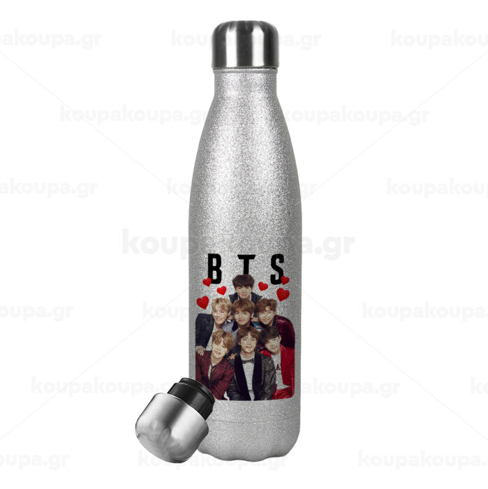BTS hearts, Μεταλλικό παγούρι θερμός Glitter Aσημένιο (Stainless steel), διπλού τοιχώματος, 500ml
