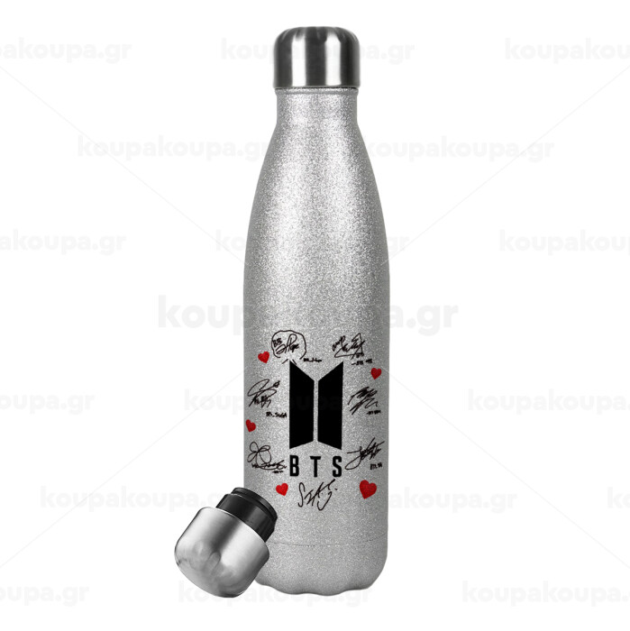 BTS signs, Μεταλλικό παγούρι θερμός Glitter Aσημένιο (Stainless steel), διπλού τοιχώματος, 500ml