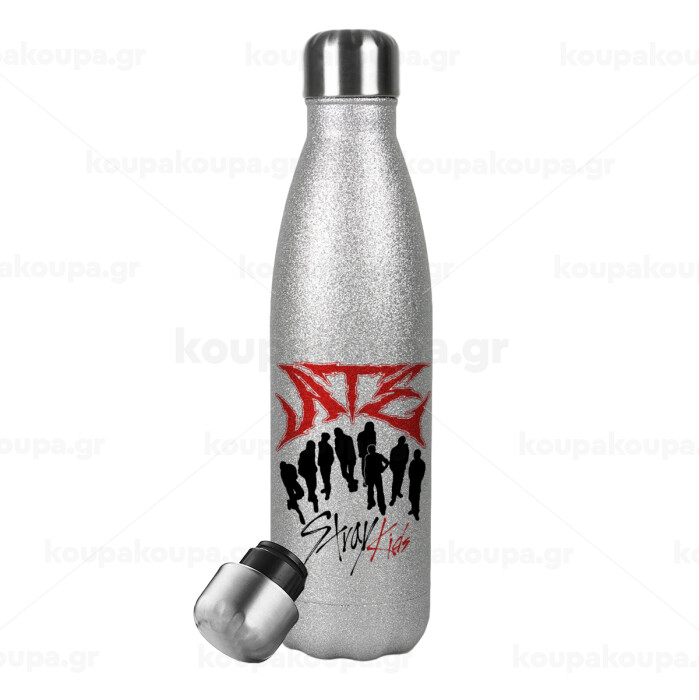 Stray Kids Boy band, Μεταλλικό παγούρι θερμός Glitter Aσημένιο (Stainless steel), διπλού τοιχώματος, 500ml