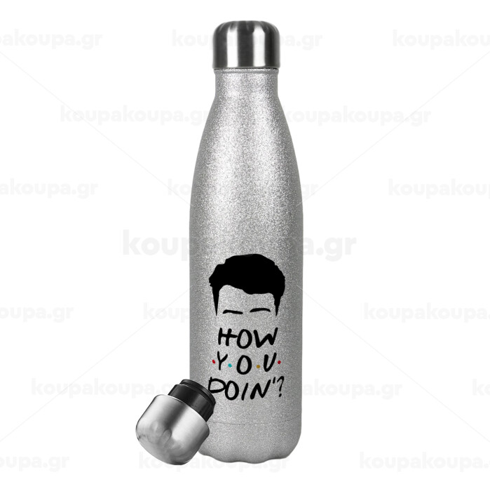 Friends how you doin?, Μεταλλικό παγούρι θερμός Glitter Aσημένιο (Stainless steel), διπλού τοιχώματος, 500ml