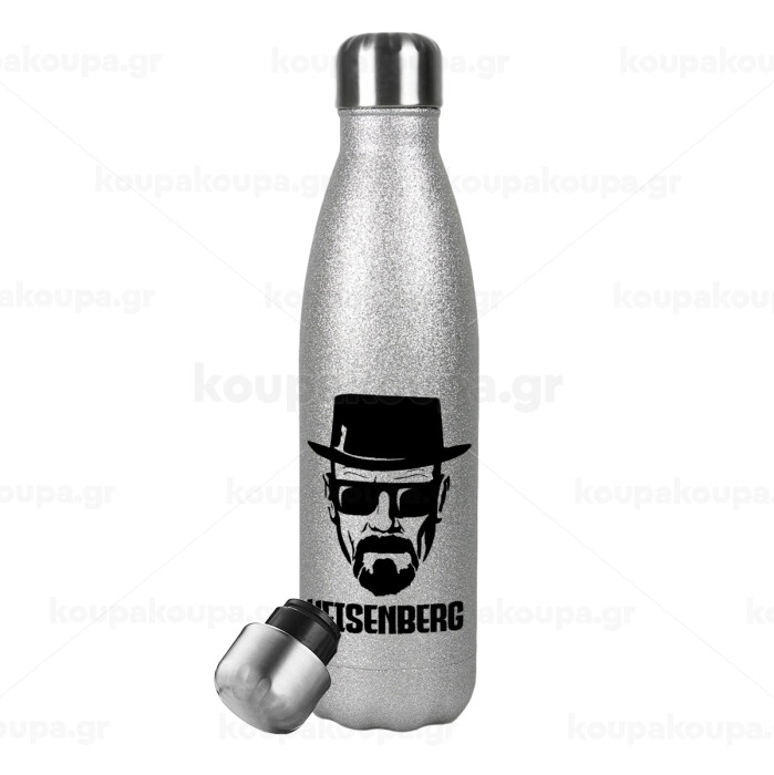 Heisenberg breaking bad, Μεταλλικό παγούρι θερμός Glitter Aσημένιο (Stainless steel), διπλού τοιχώματος, 500ml