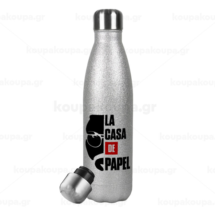 La casa de papel, Μεταλλικό παγούρι θερμός Glitter Aσημένιο (Stainless steel), διπλού τοιχώματος, 500ml
