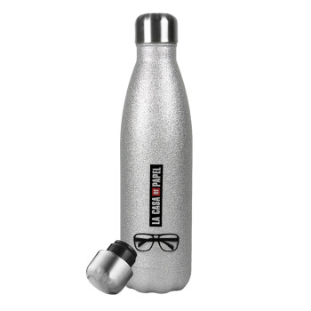 la professor, γυαλιά, Μεταλλικό παγούρι θερμός Glitter Aσημένιο (Stainless steel), διπλού τοιχώματος, 500ml