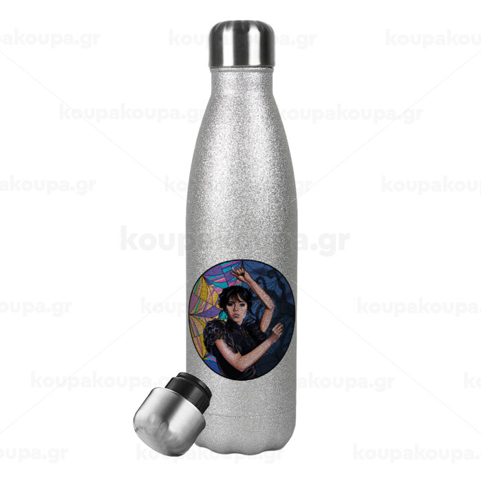 Wednesday dance, Μεταλλικό παγούρι θερμός Glitter Aσημένιο (Stainless steel), διπλού τοιχώματος, 500ml