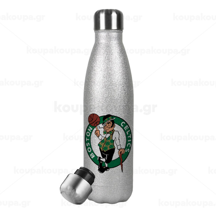 Boston Celtics, Μεταλλικό παγούρι θερμός Glitter Aσημένιο (Stainless steel), διπλού τοιχώματος, 500ml