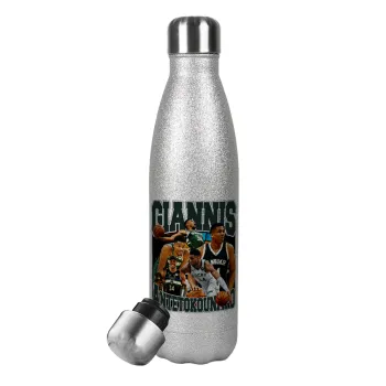Giannis Antetokounmpo, Μεταλλικό παγούρι θερμός Glitter Aσημένιο (Stainless steel), διπλού τοιχώματος, 500ml