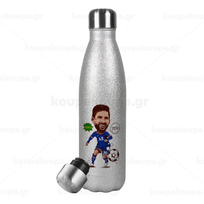 Lionel Messi drawing, Μεταλλικό παγούρι θερμός Glitter Aσημένιο (Stainless steel), διπλού τοιχώματος, 500ml
