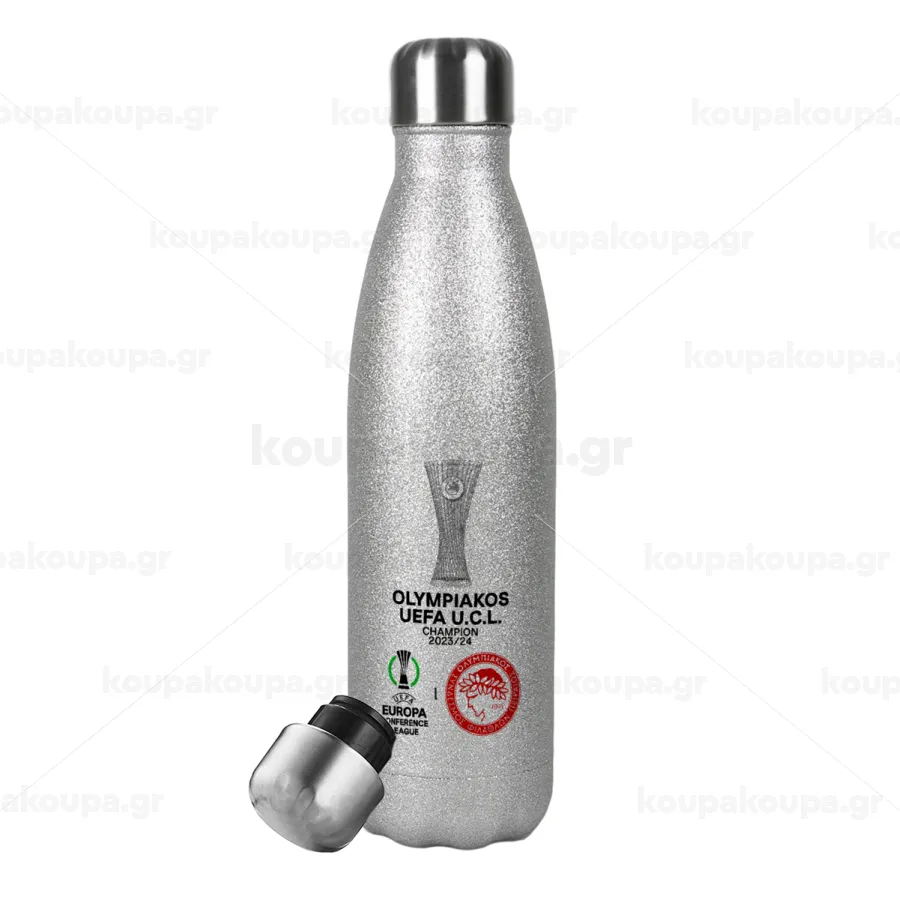 Ολυμπιακός νικητής UEFA Europa Conference League Champion 2023/24, Μεταλλικό παγούρι θερμός Glitter Aσημένιο (Stainless steel), διπλού τοιχώματος, 500ml