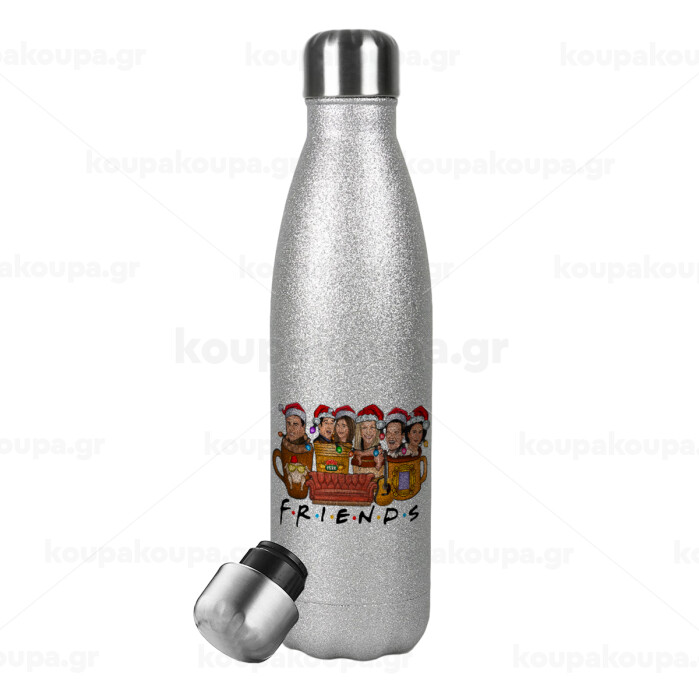 FRIENDS xmas, Μεταλλικό παγούρι θερμός Glitter Aσημένιο (Stainless steel), διπλού τοιχώματος, 500ml