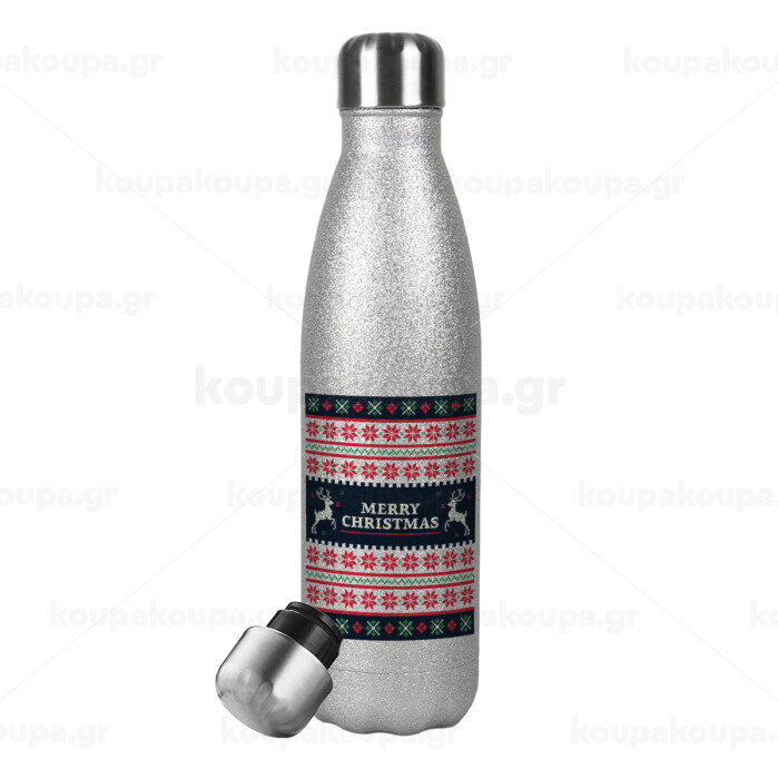 Merry Christmas Vintage, Μεταλλικό παγούρι θερμός Glitter Aσημένιο (Stainless steel), διπλού τοιχώματος, 500ml