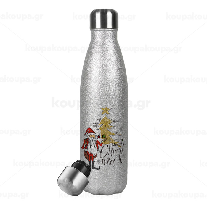 Santa Claus gold, Μεταλλικό παγούρι θερμός Glitter Aσημένιο (Stainless steel), διπλού τοιχώματος, 500ml