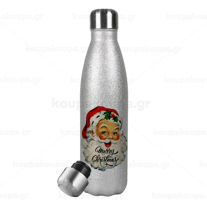 Santa vintage, Μεταλλικό παγούρι θερμός Glitter Aσημένιο (Stainless steel), διπλού τοιχώματος, 500ml