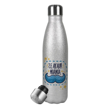 Σε αγαπώ μπαμπά!!!, Μεταλλικό παγούρι θερμός Glitter Aσημένιο (Stainless steel), διπλού τοιχώματος, 500ml