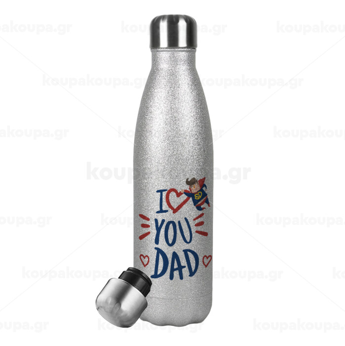 Super Dad, Μεταλλικό παγούρι θερμός Glitter Aσημένιο (Stainless steel), διπλού τοιχώματος, 500ml