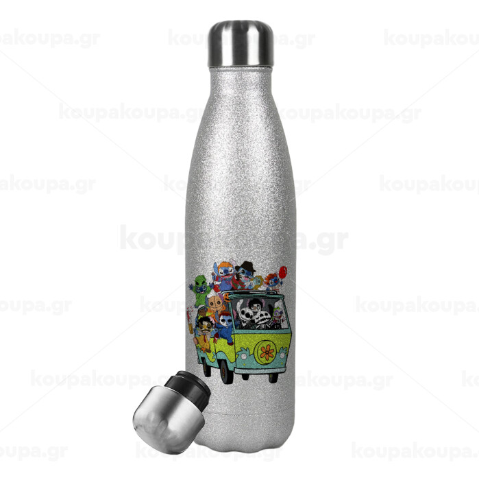 Stitch Halloween scooby car, Μεταλλικό παγούρι θερμός Glitter Aσημένιο (Stainless steel), διπλού τοιχώματος, 500ml