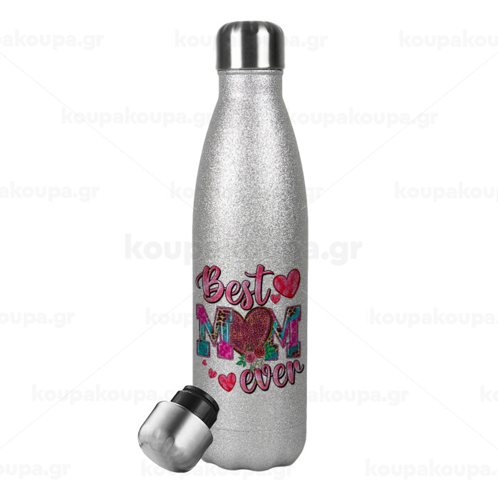 Best mom ever Mother's Day pink, Μεταλλικό παγούρι θερμός Glitter Aσημένιο (Stainless steel), διπλού τοιχώματος, 500ml