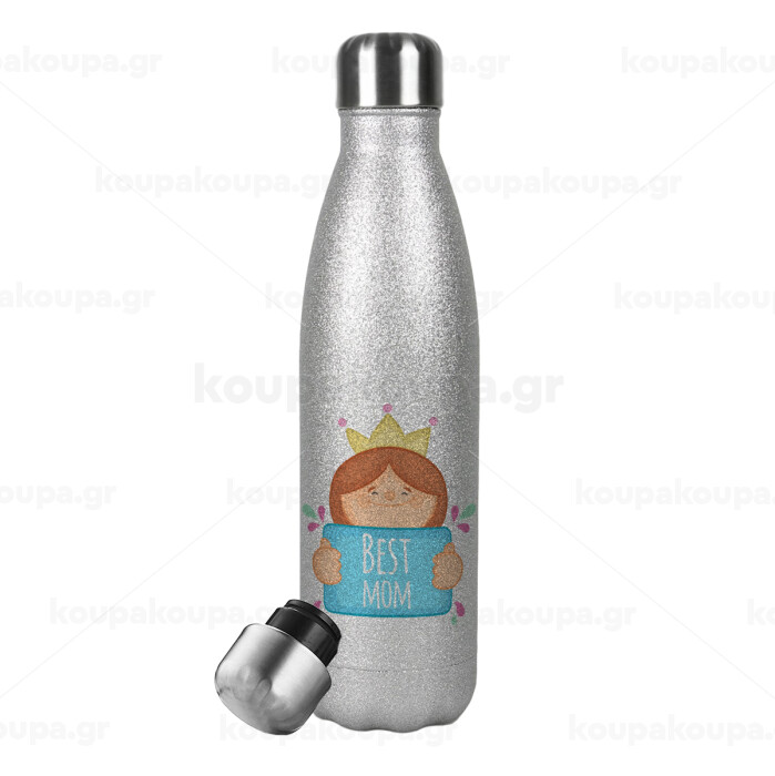 Best mom Princess, Μεταλλικό παγούρι θερμός Glitter Aσημένιο (Stainless steel), διπλού τοιχώματος, 500ml