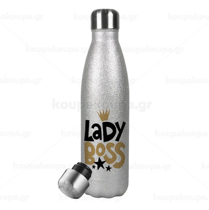 Lady Boss, Μεταλλικό παγούρι θερμός Glitter Aσημένιο (Stainless steel), διπλού τοιχώματος, 500ml