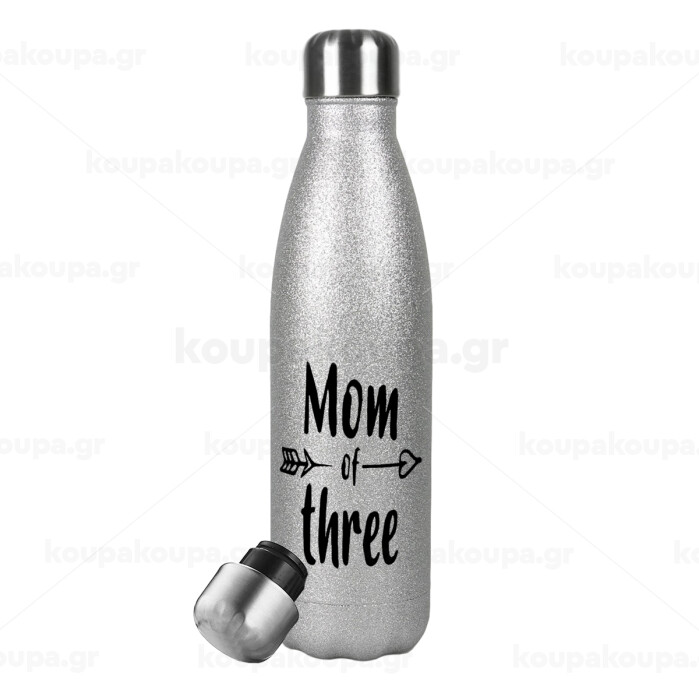 Mom of three, Μεταλλικό παγούρι θερμός Glitter Aσημένιο (Stainless steel), διπλού τοιχώματος, 500ml