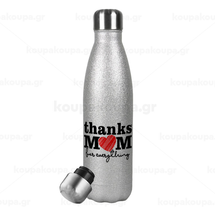 Thanks mom for everything, Μεταλλικό παγούρι θερμός Glitter Aσημένιο (Stainless steel), διπλού τοιχώματος, 500ml