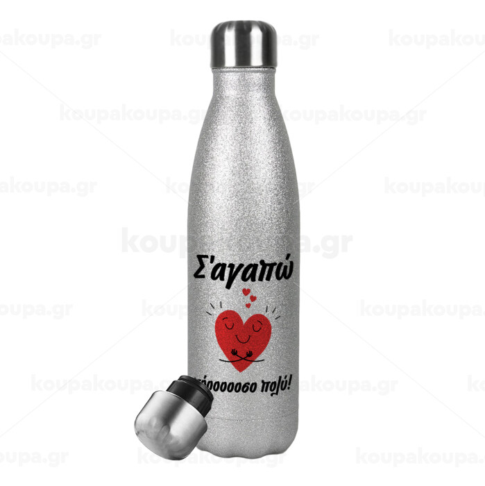 Σ΄αγαπώ τόοοοσο πολύ καρδιά, Μεταλλικό παγούρι θερμός Glitter Aσημένιο (Stainless steel), διπλού τοιχώματος, 500ml